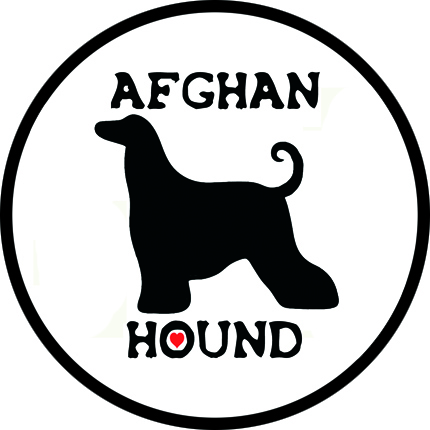 Au centre de l’autocollant se trouve le silhouette élégante d’un Lévrier Afghan, avec en dessous le mot « Afghan Hound», dont la lettre O est ornée d’un petit cœur rouge. Un détail charmant qui souligne l’amour pour cette race exceptionnelle.