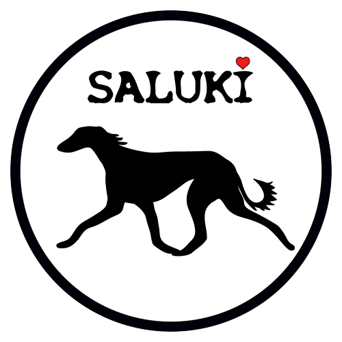 Au centre de l’autocollant se trouve le silhouette élégante d’un Saluki, avec en dessous le mot « Saluki », dont la lettre I est ornée d’un petit cœur rouge. Un détail charmant qui souligne l’amour pour cette race exceptionnelle.