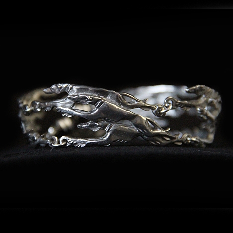 Ce bracelet pour lévriers exceptionnel est composé de quatre sections, chacune ornée de trois lévriers finement détaillés en pleine course. Le design évoque l’élégance, la vitesse et le mouvement: des caractéristiques emblématiques de ces chiens remarquables.