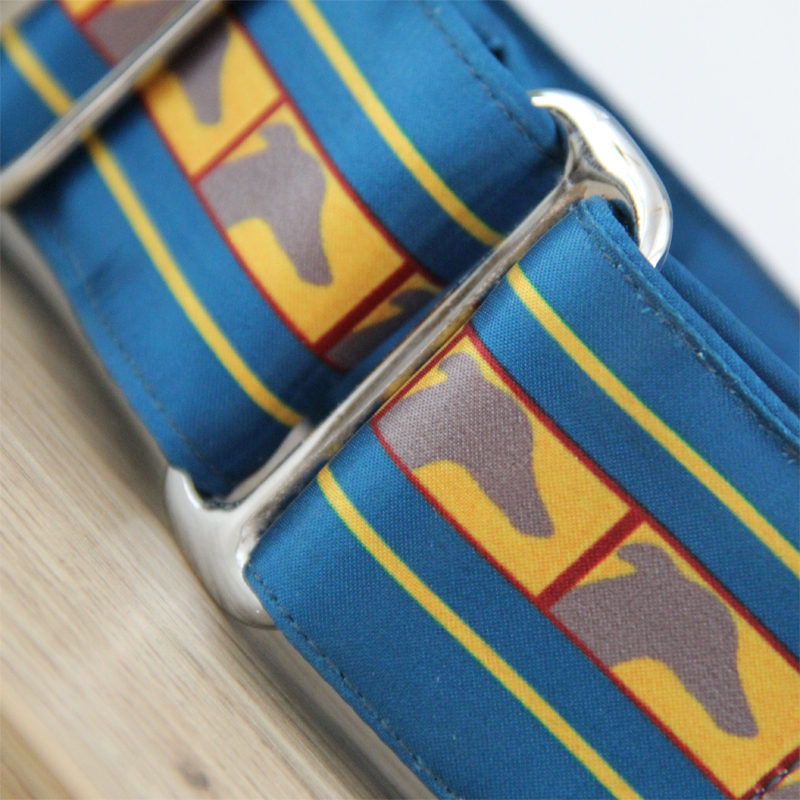 Ce collier martingale pour lévriers est fabriqué dans un tissu vraiment unique : un motif à pois ludique, subtilement enrichi de petits lévriers.